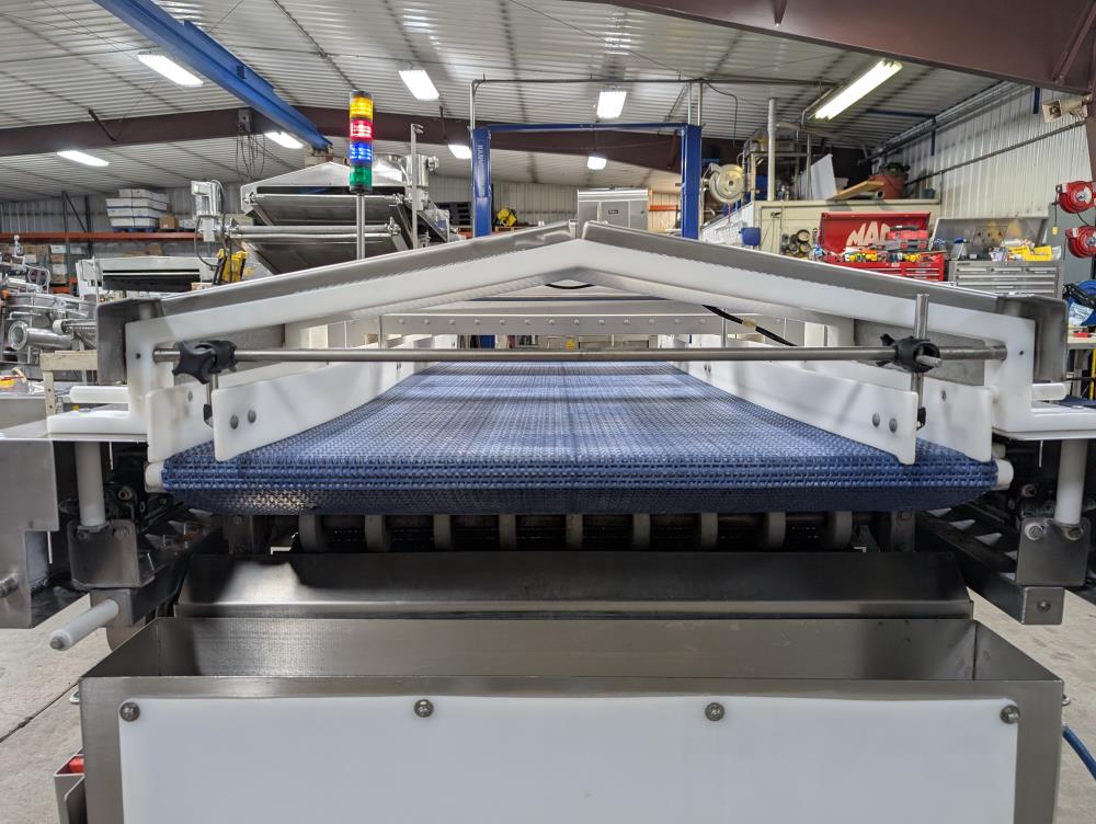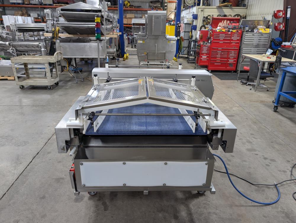 Model: V4. S/N: B638052535, Head Type: Rectangular 100/200/300. SS detector head, Aperture: 37.25 in. wide x 4.875 in. tall, Product clearance: 3.75 in. Blue Plastic interlock belt conveyor, 72 in. long x 36 in. wide x 37 in. tall, w/ pneumatic retracting reject. SS reject bin. Allen Bradley Powerflex vfd. Adjustable poly guide rails. SS construction, on casters. Air Requirement: 80 PSI. 110V, 1 Phase, 50/60 Hz, 15 Amp. Overall Dimensions: 74 in. long x 67 in. wide x 70 in. tall.