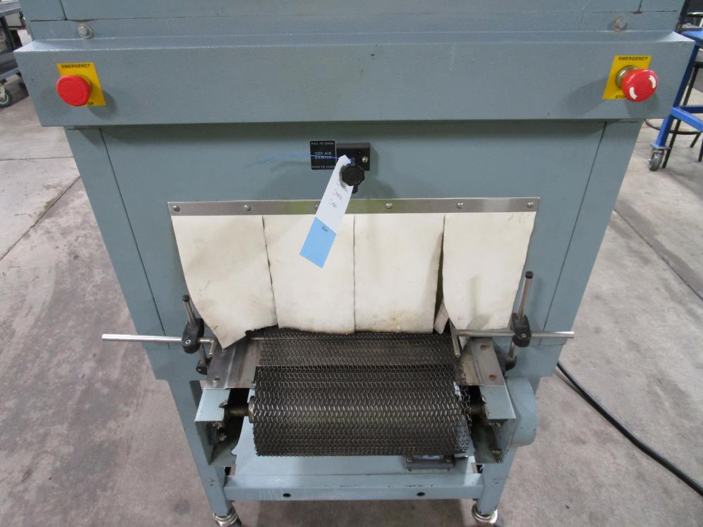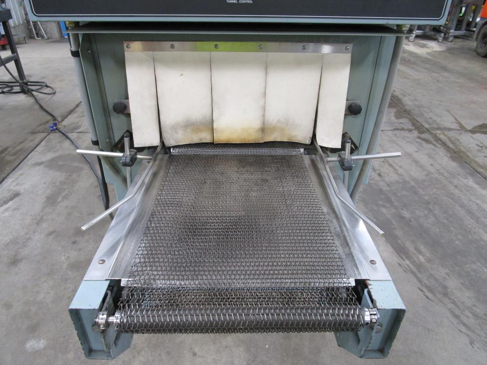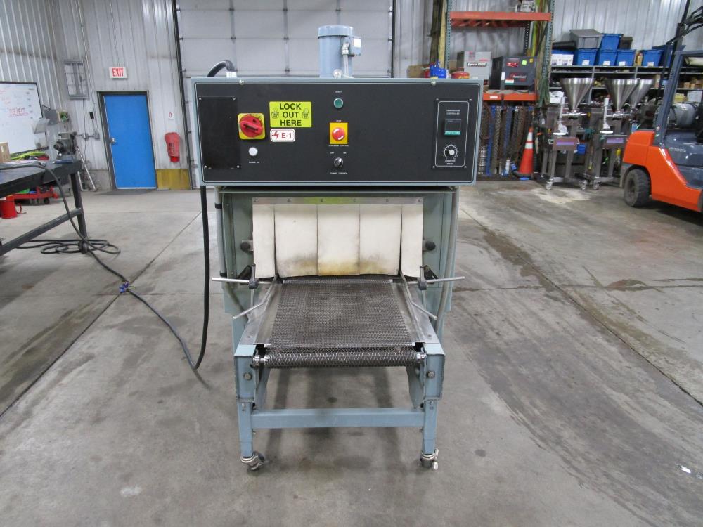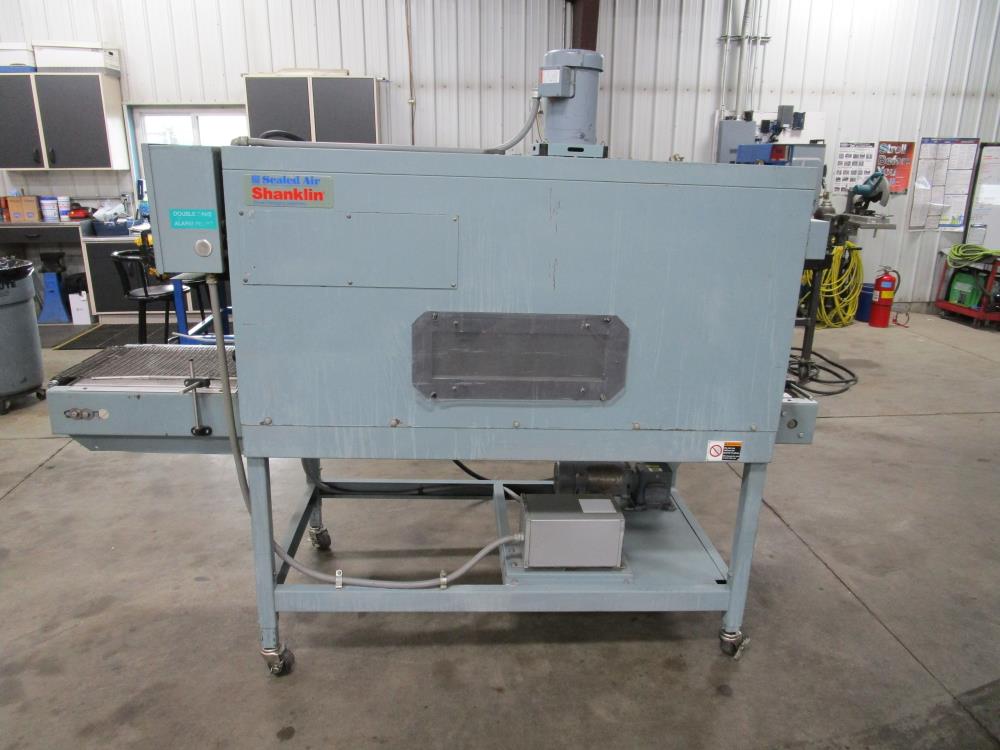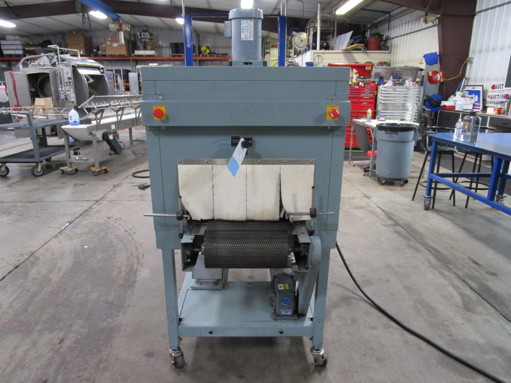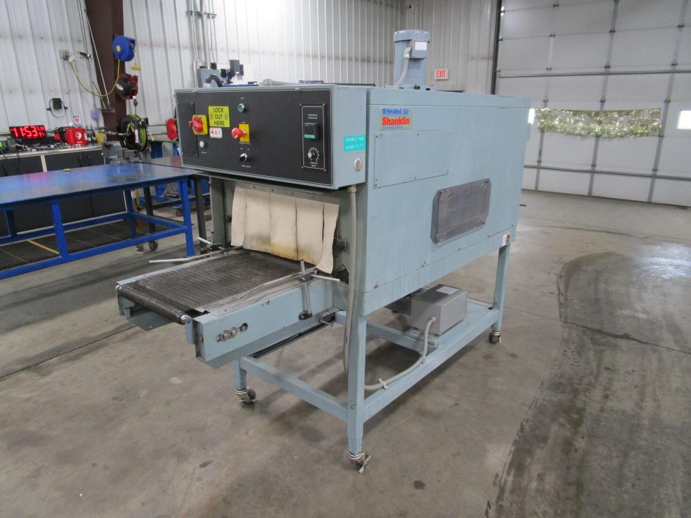 Shanklin Shrink Tunnel, Model: T71, SN: T08249-01, Tunnel: 60 in. long, Aperture 22 in. wide x 10 3/4 in. tall. Conveyor: 98 in. long x 15 in. wide x 36 in. tall, wire mesh belt. Variable speed conveyor, max speed 3 ft./sec. Carbon Steel construction, adjustable legs, on casters. 460V, 3 Phase, 60 Hz, 38 FLA. Overall Dimension: 96 in. long x 36 in. wide x 76 in. tall