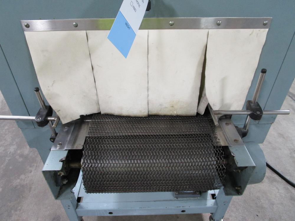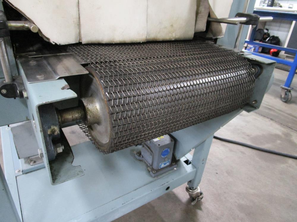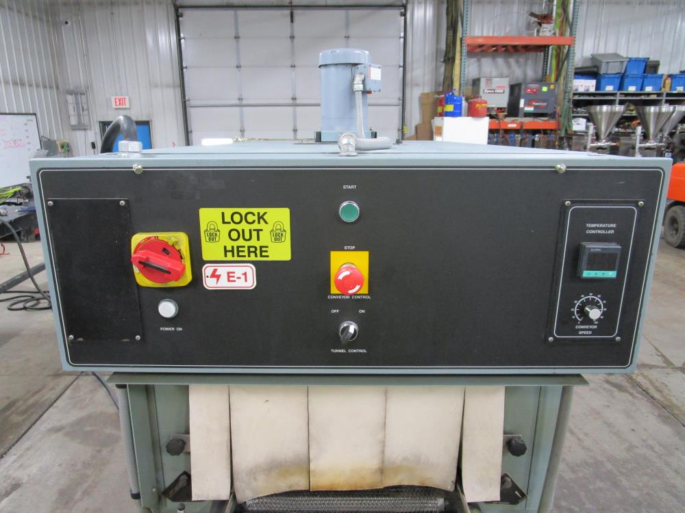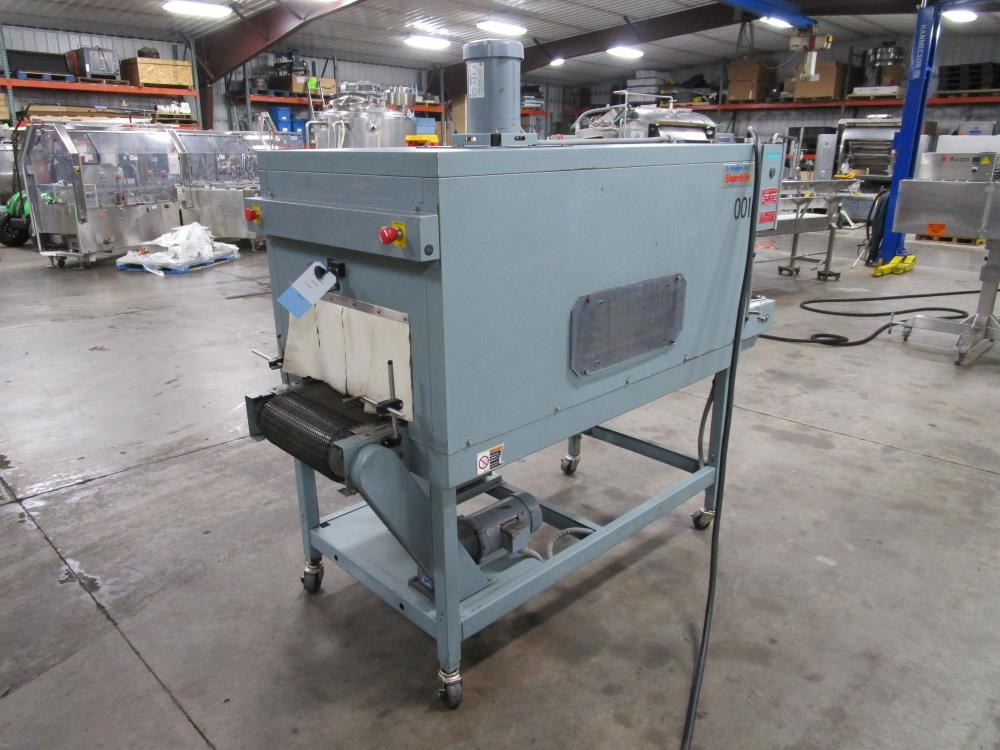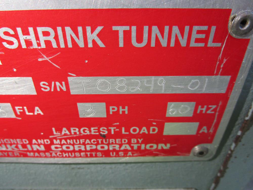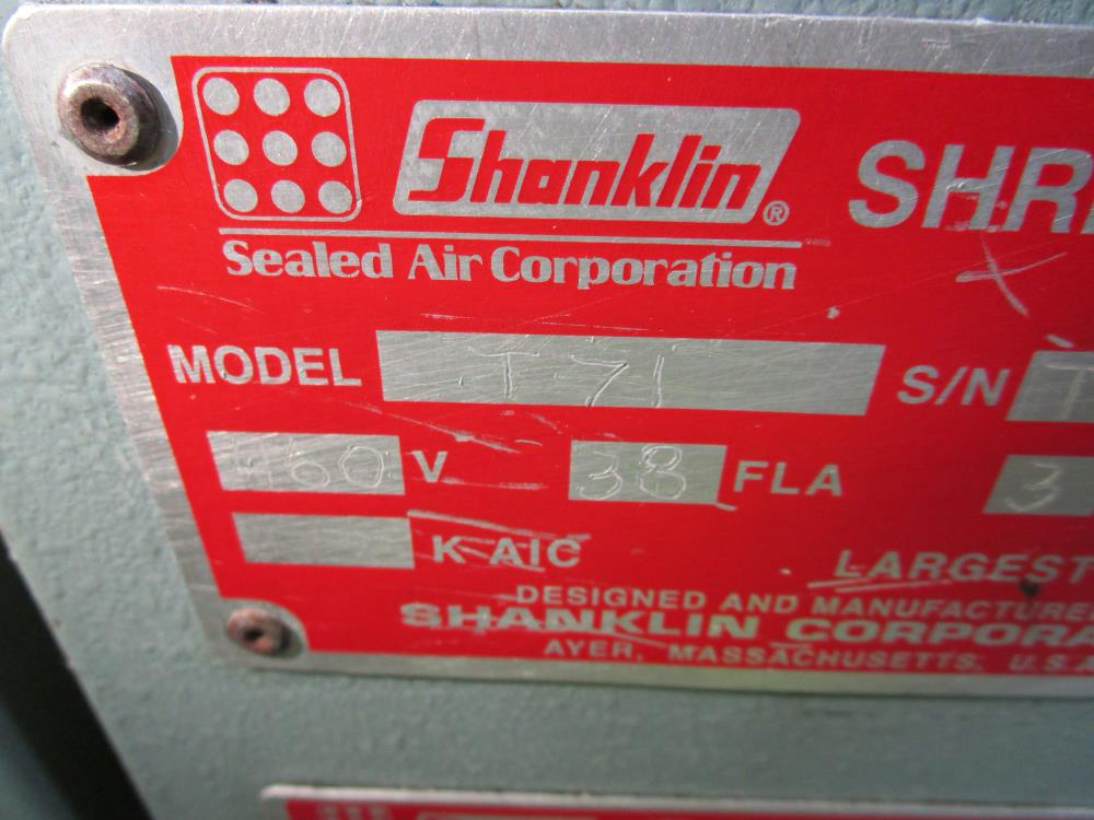 Shanklin Shrink Tunnel, Model: T71, SN: T08249-01, Tunnel: 60 in. long, Aperture 22 in. wide x 10 3/4 in. tall. Conveyor: 98 in. long x 15 in. wide x 36 in. tall, wire mesh belt. Variable speed conveyor, max speed 3 ft./sec. Carbon Steel construction, adjustable legs, on casters. 460V, 3 Phase, 60 Hz, 38 FLA. Overall Dimension: 96 in. long x 36 in. wide x 76 in. tall