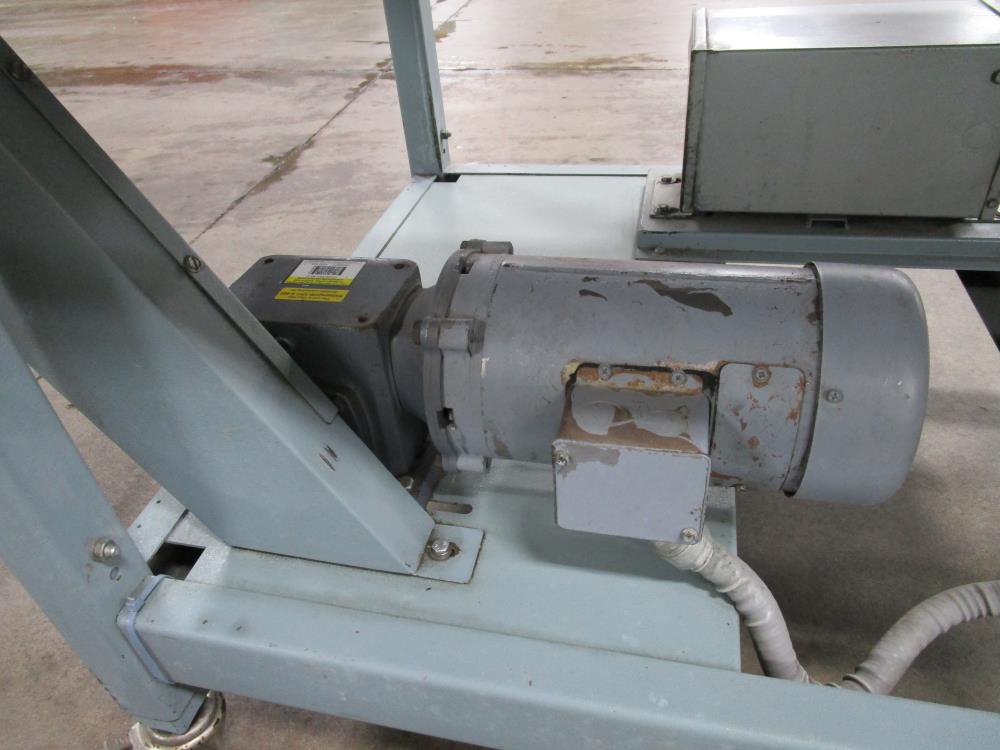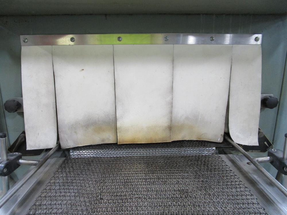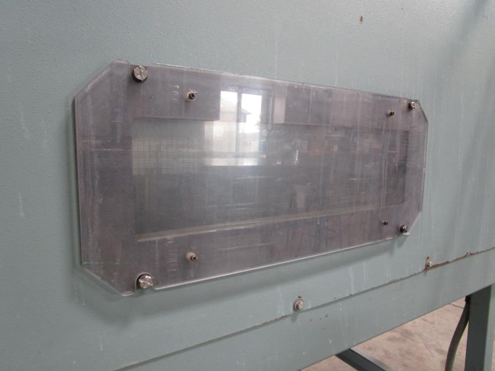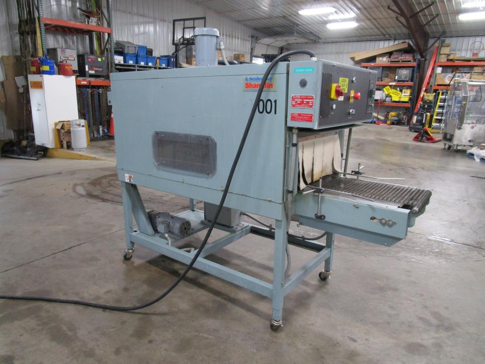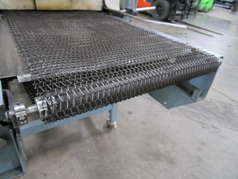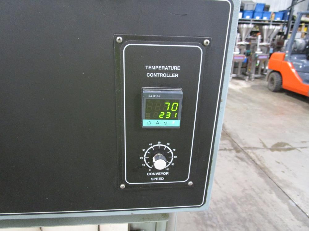 Shanklin Shrink Tunnel, Model: T71, SN: T08249-01, Tunnel: 60 in. long, Aperture 22 in. wide x 10 3/4 in. tall. Conveyor: 98 in. long x 15 in. wide x 36 in. tall, wire mesh belt. Variable speed conveyor, max speed 3 ft./sec. Carbon Steel construction, adjustable legs, on casters. 460V, 3 Phase, 60 Hz, 38 FLA. Overall Dimension: 96 in. long x 36 in. wide x 76 in. tall