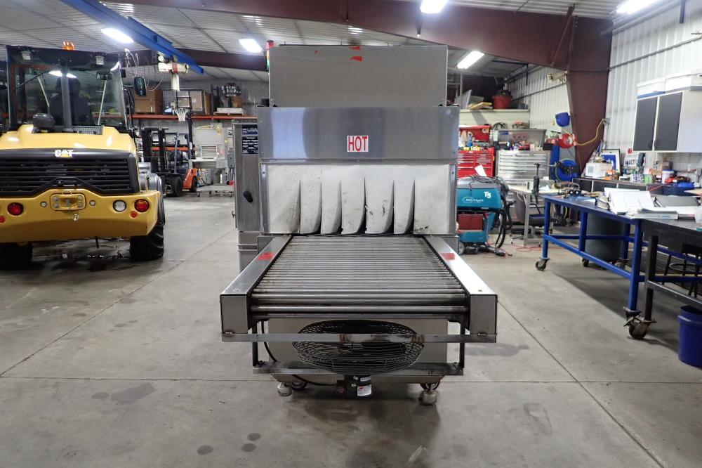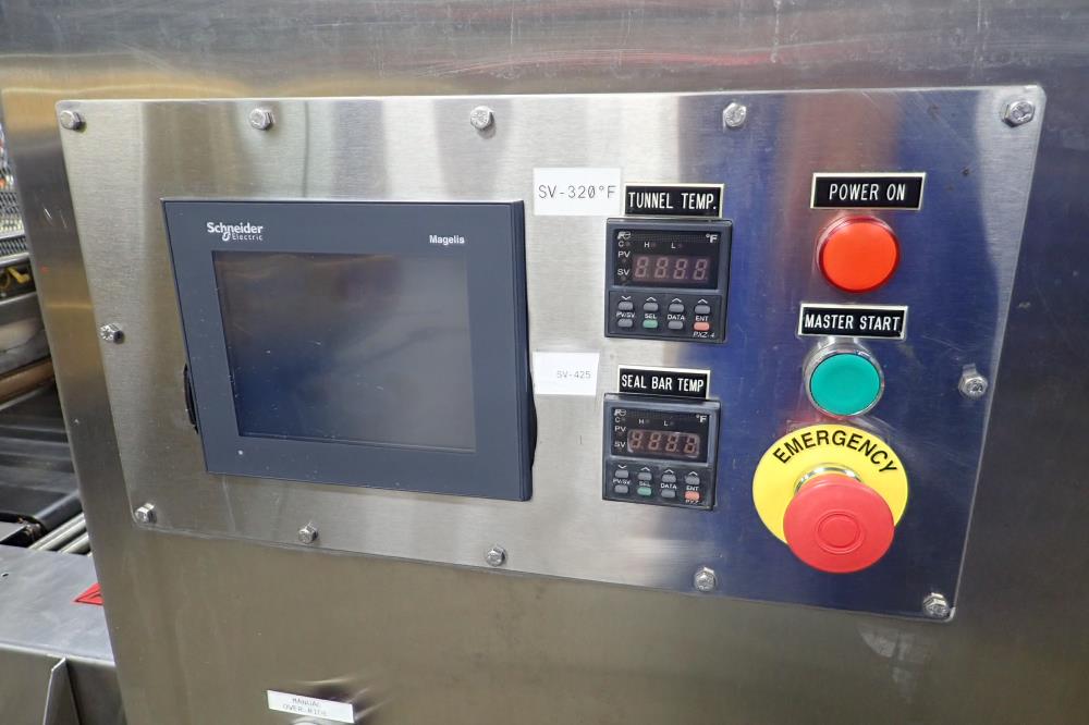 Poly Pack inline sleeve wrapper with heat tunnel. Model IL-24L, SN 3394. Belt to belt transfers, infeed conveyor belt 32 in. long x 19.75 in. wide x 40 in. tall, discharge conveyor belt 17 in. long x 19.75 in. wide. Seal bar 26 in. wide, currently set for 7.5 in. tall clearance. Heat tunnel with SS rod belt 120 in. long x 26 in. wide x 40 in. tall. Tunnel 60 in. long, aperture 27 in. wide x 14 in. tall, with ambient cooling fan on discharge. Digital temp controls for tunnel and seal bar. Schneider Electric 6 in. touch screen control. SS electrical enclosure. Pneumatic enclosure. Heavy gauge stainless steel main frame. Electrical requirements 480-volt, 3 phase, 60 hz, 32 amp.