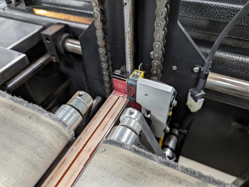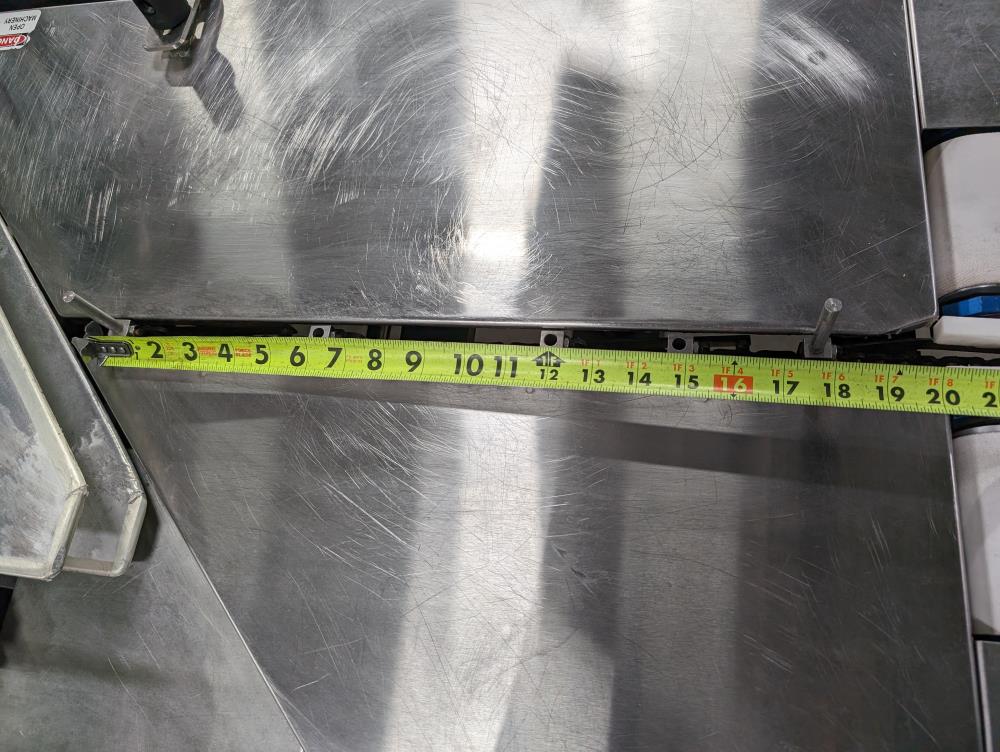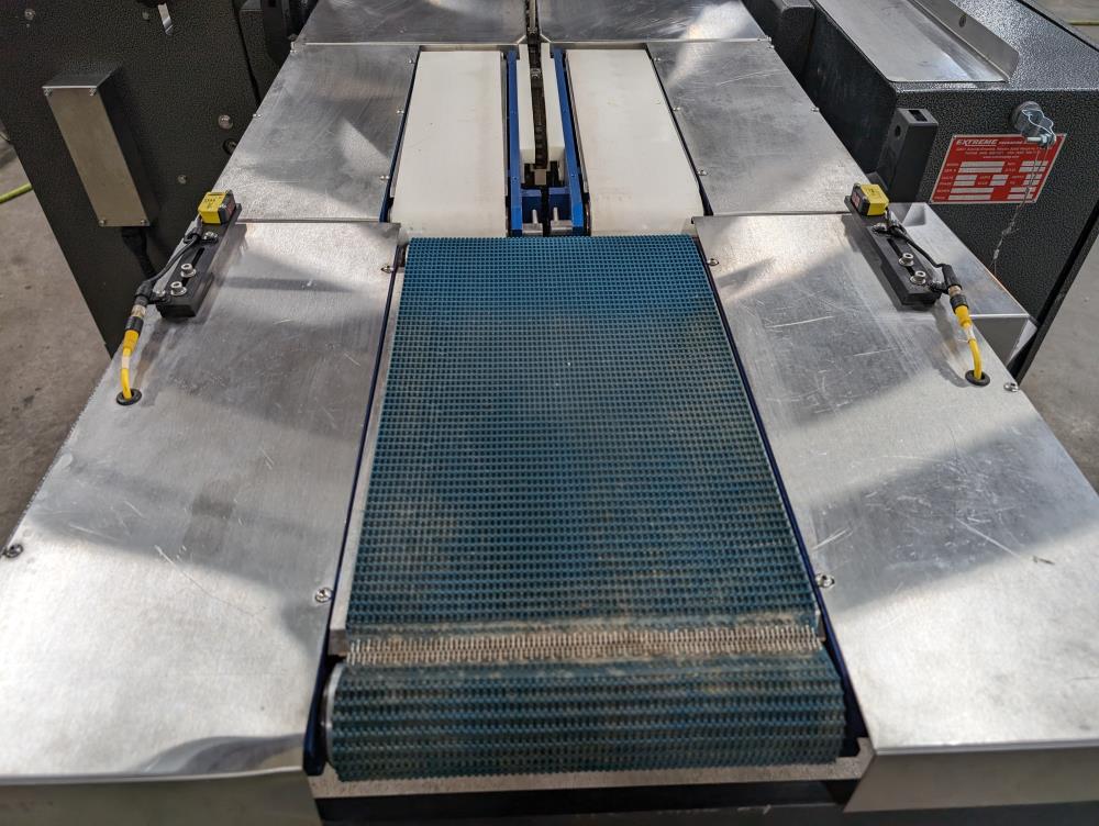 - Dual 18-inch-long x 4-inch-wide belts with pneumatic product stop