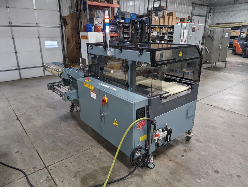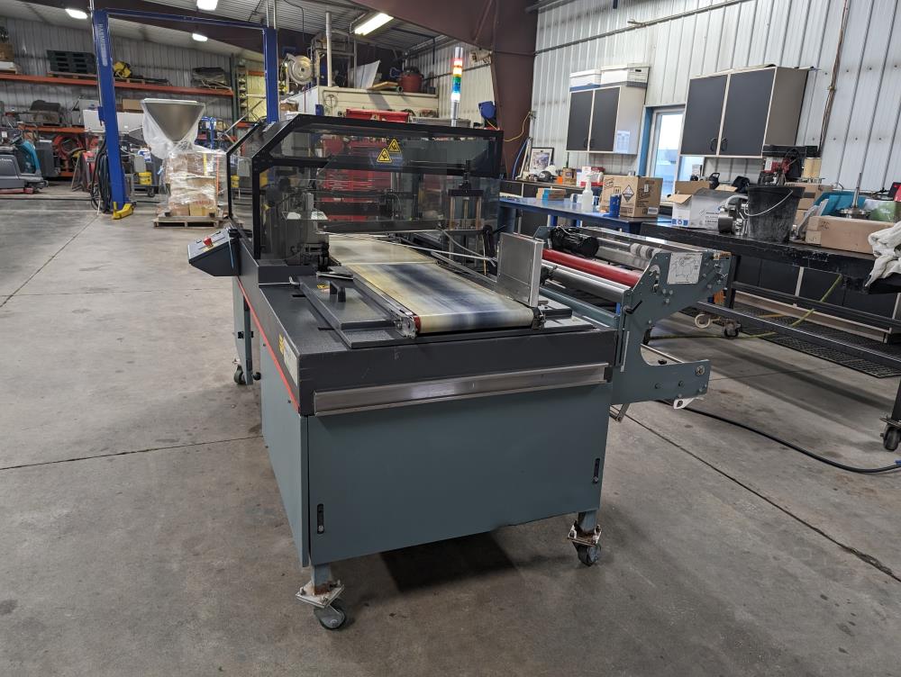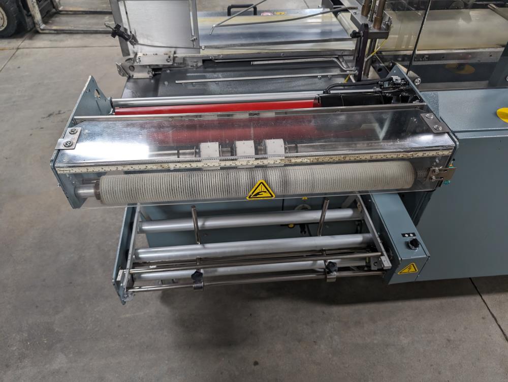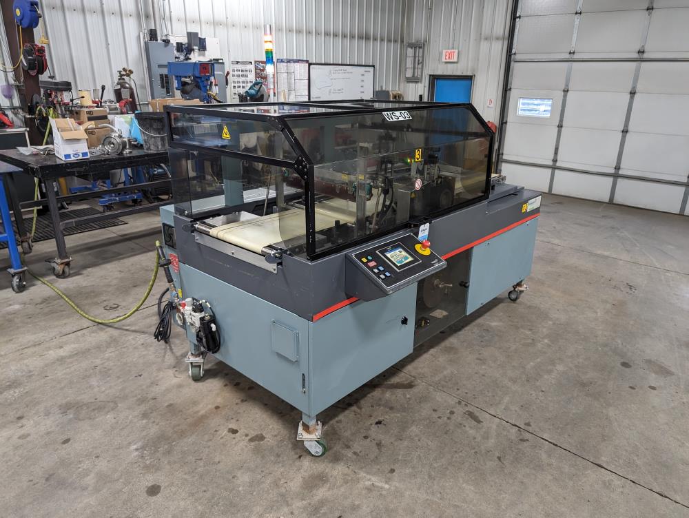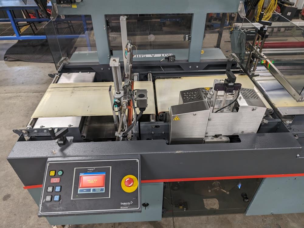 2016 Shanklin Triumph 2 automatic form-fill-seal wrapper. Model TR2. Longitude seal 21 in. wide. Continous side seal with scrap winder with break detection. Infeed conveyor 33 in. long x 14 in. wide x 37 in. tall. Side seal conveyor 27 in. long x 15.5 in. wide. Discharge conveyor 29 in. long x 14.5 in. wide x 37 in. tall. Color touch screen. Allen Bradley micrologix 1400 plc controller. ABB ac speed controllers. Electrical requirements 460-volt, 1 phase. Air requirements 3 cfm @ 70 psi. Adjustable height legs, on casters.