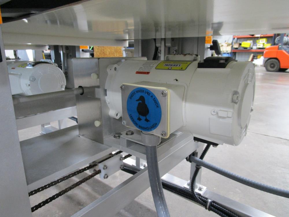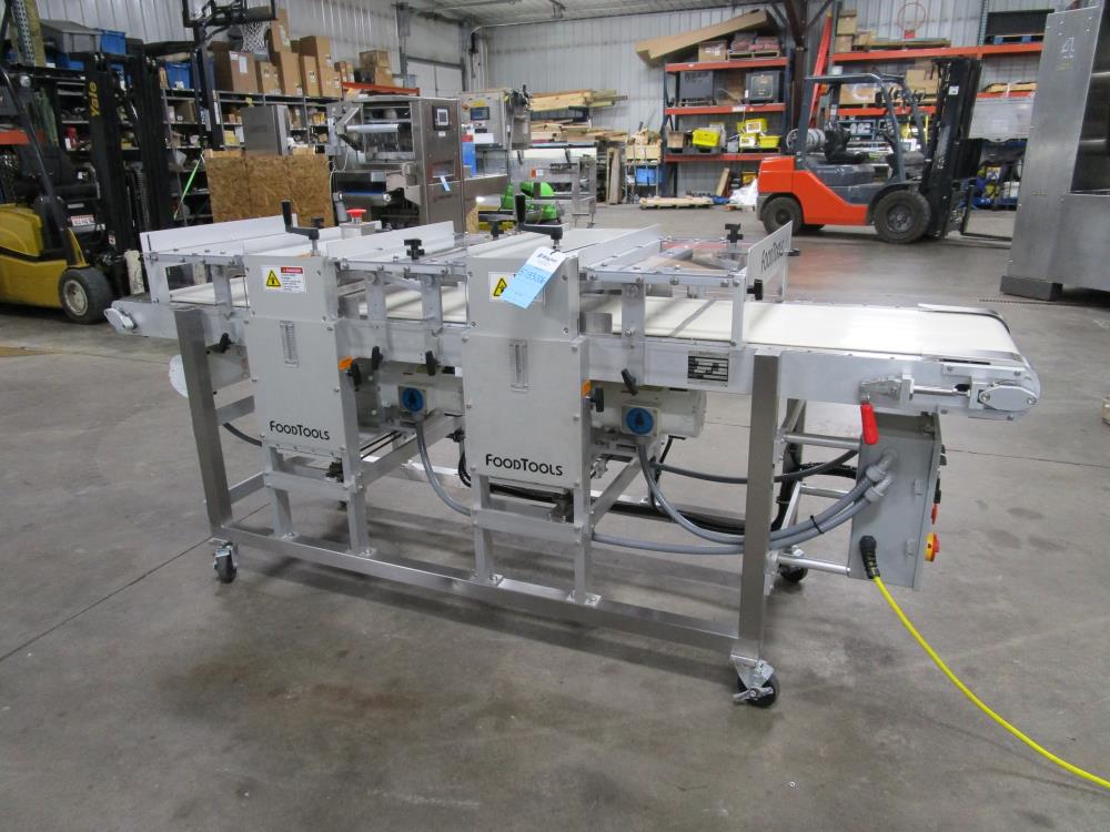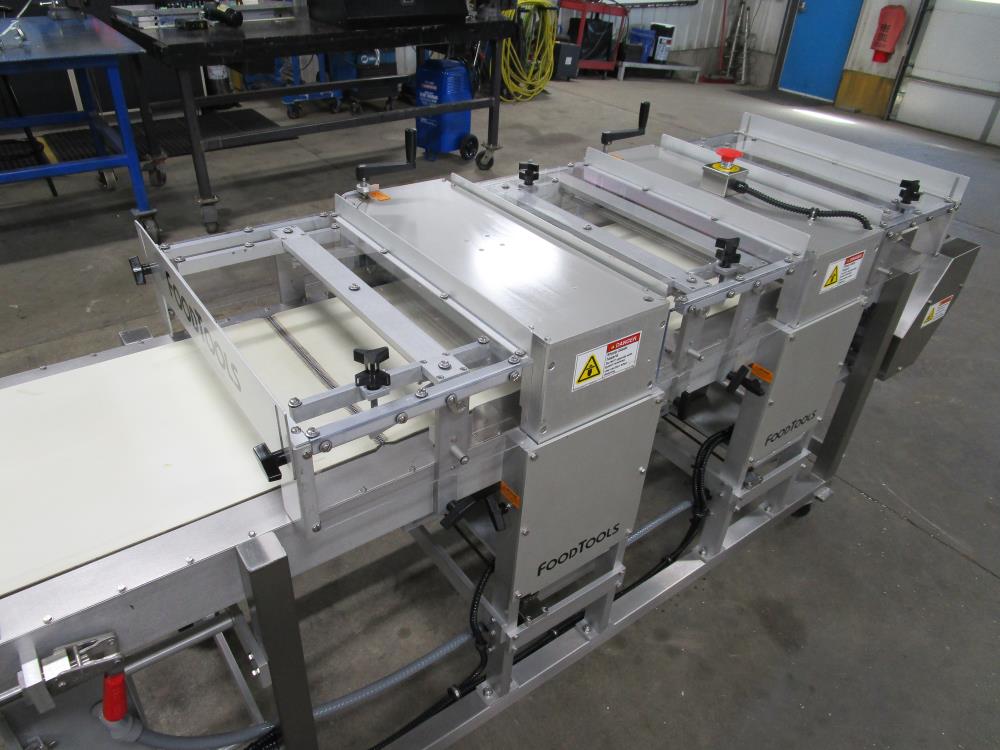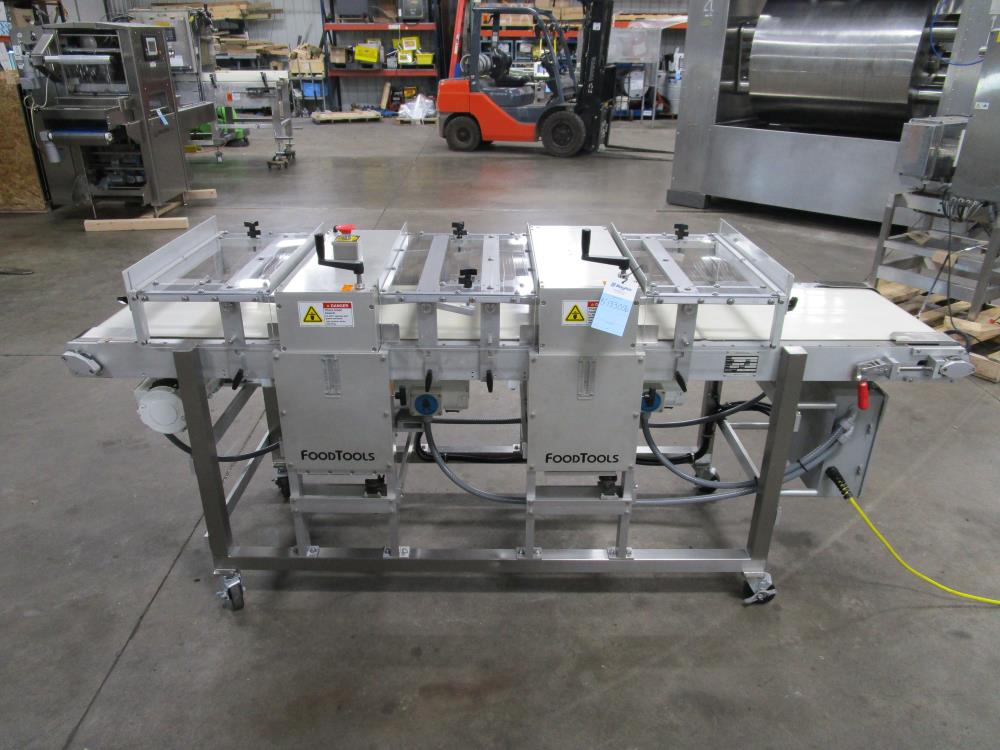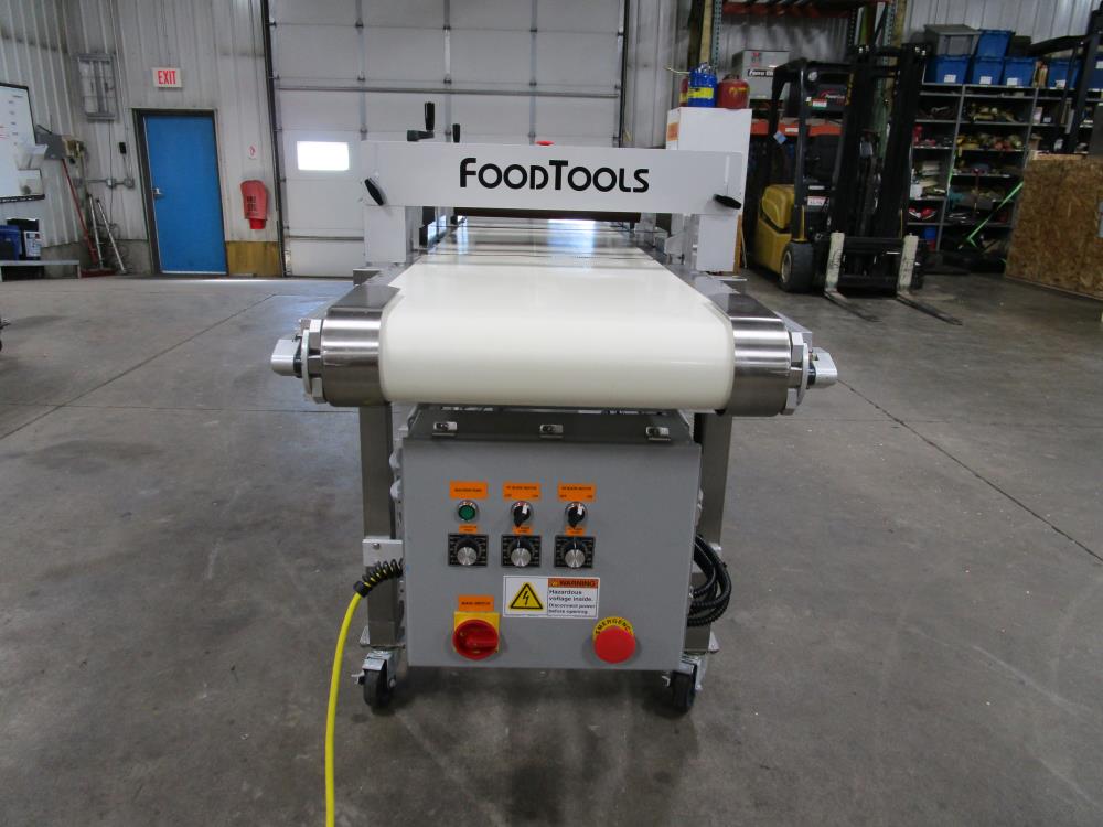 2016 FoodTools two blade horizonal cake slabber. Model CS-8AW-2, SN 5532. White vinyl conveyor belt 109 in. long x 18 in. wide x 34 in. tall, Leeson Washguard motor with variable speed. Two slabbing stations, with compression rollers, manual height adjustment from 0.3 in. to 3.5 in. thick, Leeson Washguard motors with variable speed controls. Control panel with variable speeds for both blades, variable speed for conveyor, start, and e-stop. SS frame, on locking casters