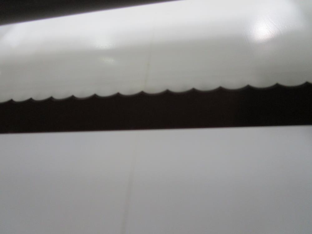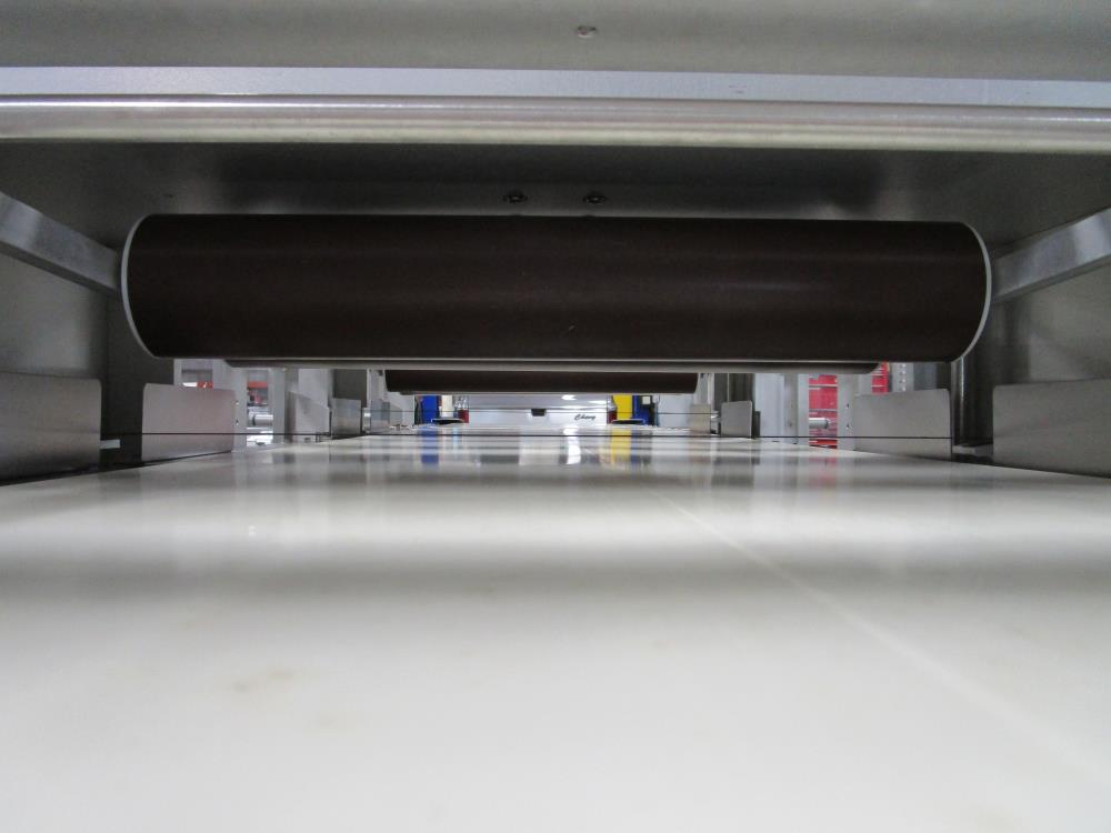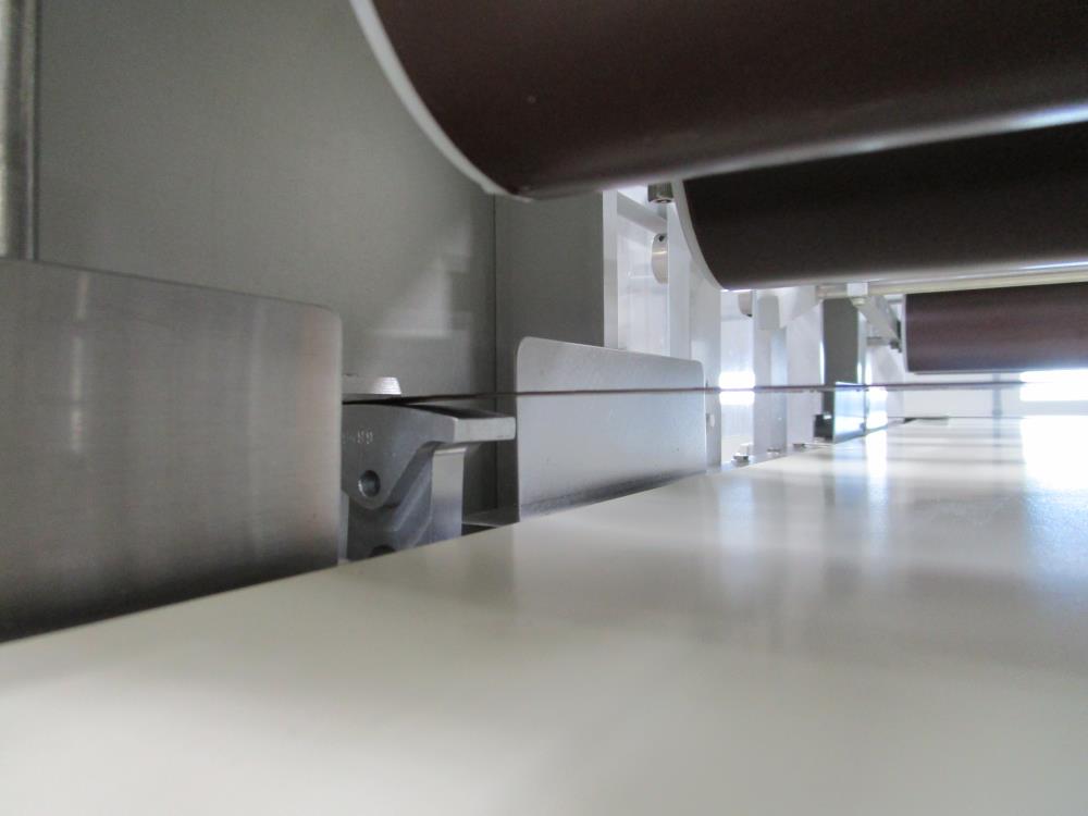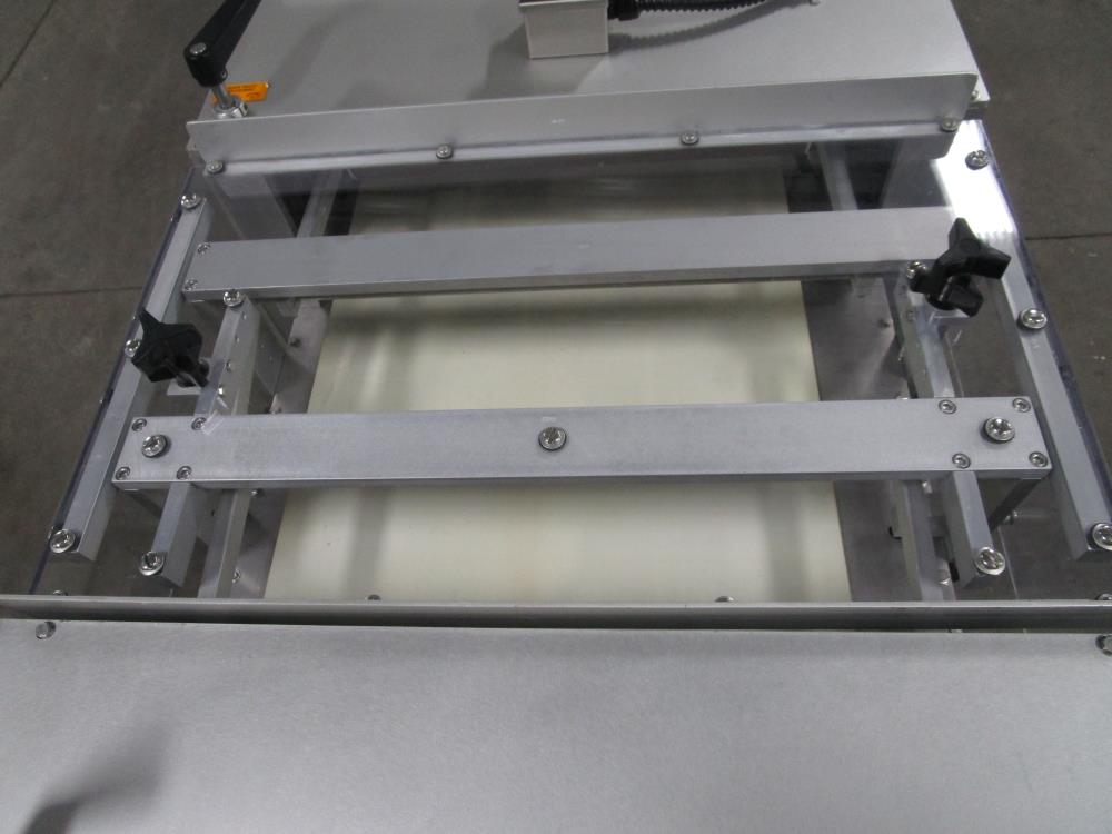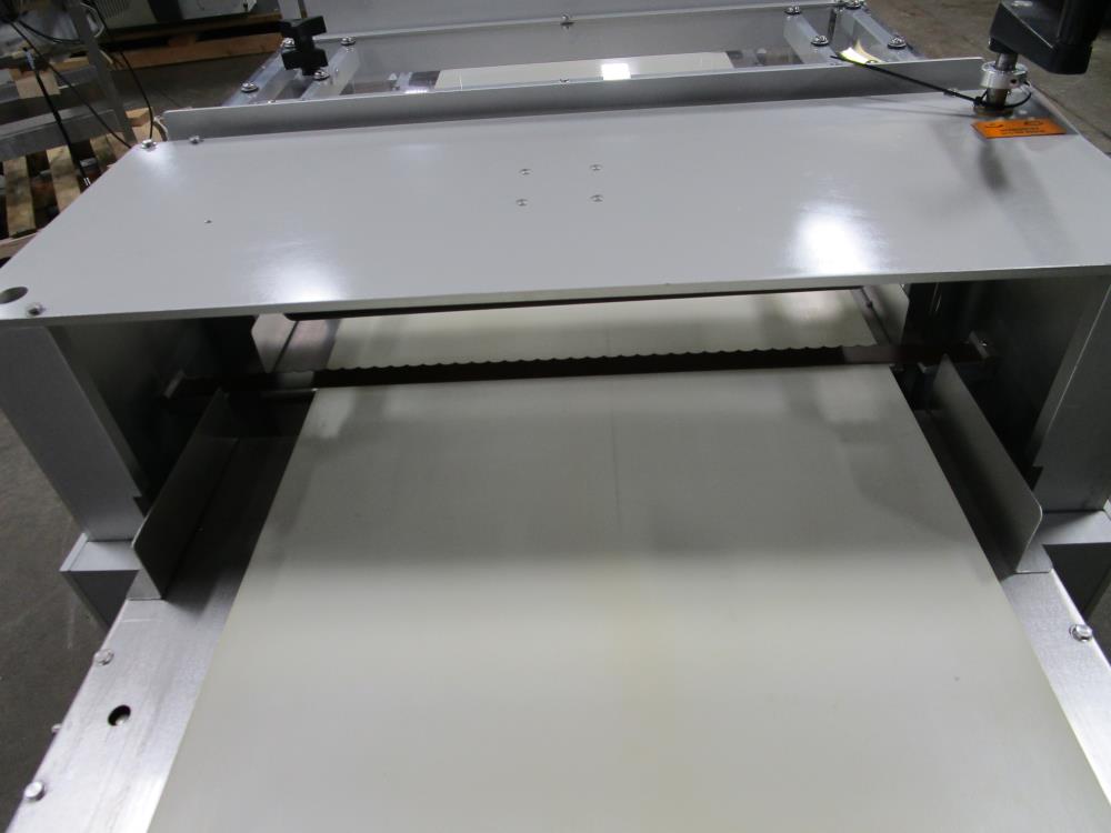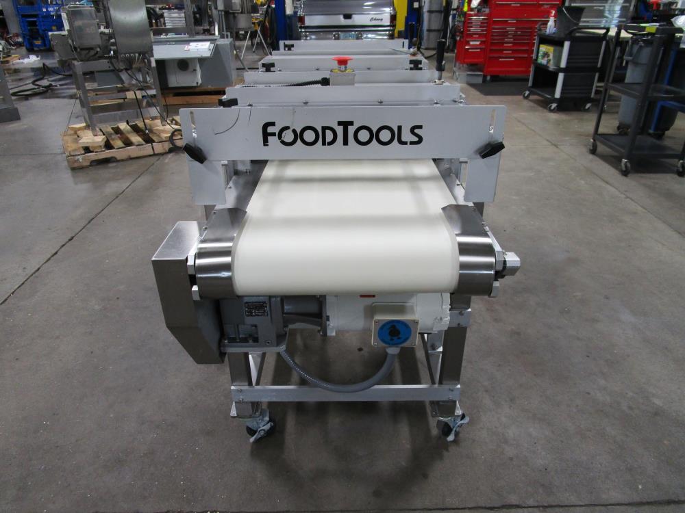 2016 FoodTools two blade horizonal cake slabber. Model CS-8AW-2, SN 5532. White vinyl conveyor belt 109 in. long x 18 in. wide x 34 in. tall, Leeson Washguard motor with variable speed. Two slabbing stations, with compression rollers, manual height adjustment from 0.3 in. to 3.5 in. thick, Leeson Washguard motors with variable speed controls. Control panel with variable speeds for both blades, variable speed for conveyor, start, and e-stop. SS frame, on locking casters